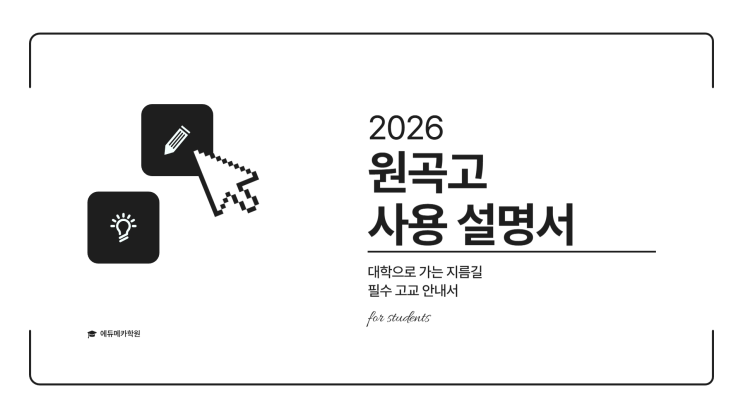 2026년 원곡고는 2024년 자공고 지정 이후 3년 차이자 고교학점제 2년 차를 맞이합니다. 원곡고는 현재 자공고 지정 이후 정부와 안산시의 풍부한 재정 지원으로 학교 프로그램들이 안산시에 있는 다른 일반고들보다 훨씬 다양하고 수시 학생부 종합 전형에 매우 특성화되고 있습니다. 에듀메카 학원에서는 올해 원곡고에 입학하는 학생들의 성공적인 학교생활을 기원하는 마음으로 직접 '원곡고 사용 설명서'를 만들었습니다. 원곡고 사용 설명서를 참고하시어, 우리 아이들 3년 뒤 좋은 대학 입시 결과를 기대해 봅니다. [2026년 원곡고1 신입생 교육과정 편제] 원곡고 1 학생들은 7월에 2학년 때 배울 개별 학생 선택과목 신청을 안....... <img src="https://blogthumb.pstatic.net/MjAyNjAxMTNfMjc1/MDAxNzY4MjgyODIwNDY4.9pgu15OJv3qRgRuSeTnSolDkaDsHaBxbsqtdhCybzwwg.WNpbWweWxBIqRzomfU78xceyPmP9OmMmnK0Vv543u10g.PNG/%C1%A6%B8%F1%C0%BB_%C0%D4%B7%C2%C7%D8%C1%D6%BC%BC%BF%E4_-001_%282%29.png?type=s3" />
