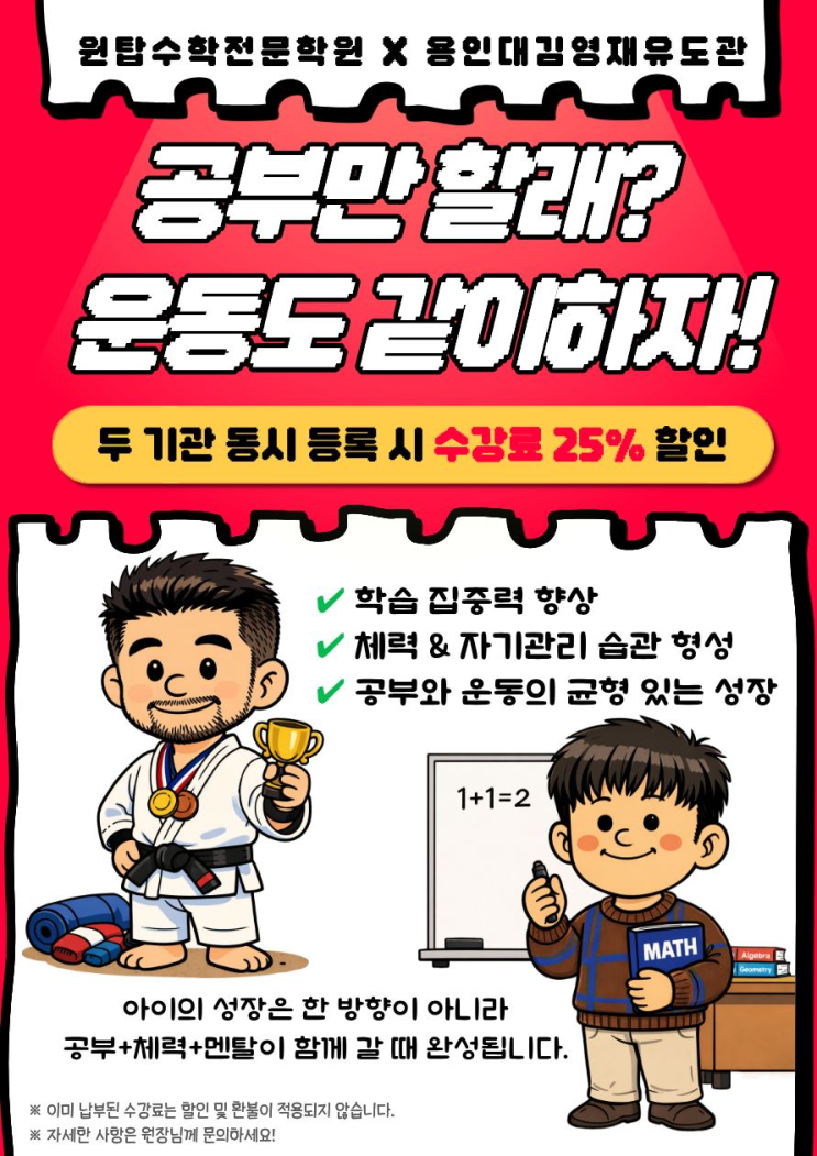 원탑수학전문학원 × 용인대김영재유도관 업무협약 체결 공부와 체력, 인성까지 함께 키웁니다. 원탑수학전문학원과 용인대김영재유도관이 아이들의 균형 있는 성장을 위해 업무협약을 체결했습니다. 이제 학습 관리뿐만 아니라 ✔ 집중력을 높이는 체력 ✔ 스스로 해내는 자기관리 습관 ✔ 바른 태도와 인성 까지 함께 만들어 갑니다. 부모님들이 가장 고민하시는 “공부만 잘하는 아이가 아닌, 스스로 성장하는 아이” 두 기관이 함께 책임지겠습니다. 공동 등록 혜택 두 기관 동시 등록 시 등록 기간 동안 수강료 25% 할인이 적용됩니다. 자세한 내용은 상담 시 안내드립니다 아이들의 미래를 위한 최고의 선택, 원탑수학과 김영재유....... <img src="https://blogthumb.pstatic.net/MjAyNjAyMTFfMjY4/MDAxNzcwODAwNDkzMTY4.nAYUQ8s7K-Ya_CL8AgqBqQY49q19q4YaVx-Q5N8IBwwg.TGNArndWZsMons8qZf2OMNgF69XS26rpOwaZAWfWAGYg.PNG/image.png?type=s3" />