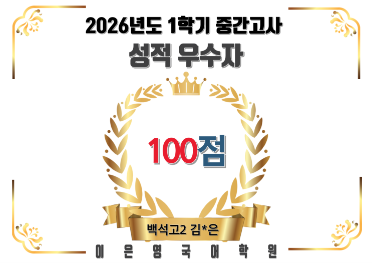 백석고 2학년 100점 김*은 _ 2026년도 1학기 중간고사 성적우수자 _ 이은영국어학원