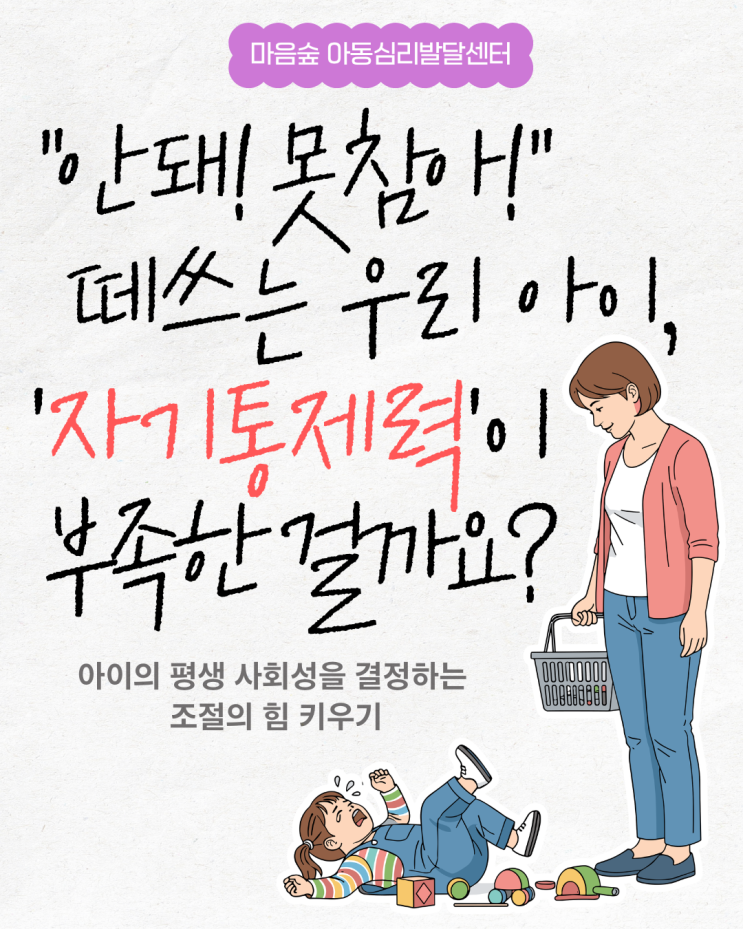 안녕하세요, 스스로 일어서는 마음 근육을 키우는 365다움의원파주운정 병원부설 마음숲 아동심리발달센터입니다. 마트에서 원하는 장난감을 사달라고 바닥에 드러눕는 아이, 순서를 기다리지 못하고 친구의 물건을 뺏는 아이를 보며 '우리 아이만 유독 참을성이 없는 걸까?' 고민하신 적 있으시죠? 오늘은 아이의 평생 사회성과 학습 능력의 밑거름이 되는 자기통제 능력(Self-Control)에 대해 깊이 있게 알아보겠습니다. 1. 자기통제 능력이란 무엇일까요? 자기통제 능력이란 단순히 '참는 것'만을 의미하지 않습니다. 목표를 달성하기 위해 자신의 충동적인 행동이나 감정을 억제하고, 상황에 맞게 조절하는 힘을 말합니....... <img src="https://blogthumb.pstatic.net/MjAyNjA0MjJfODYg/MDAxNzc2ODE5ODYxNzA5.Y5n5GkM4l5FbYGCpuWCFzUXGABM0uhtrnlRL4V4V1RQg.GJRYO8WRuYSBUE79wfn1p5OZMCA1GRZh6cJAXyHmsAUg.PNG/1.png?type=s3" />