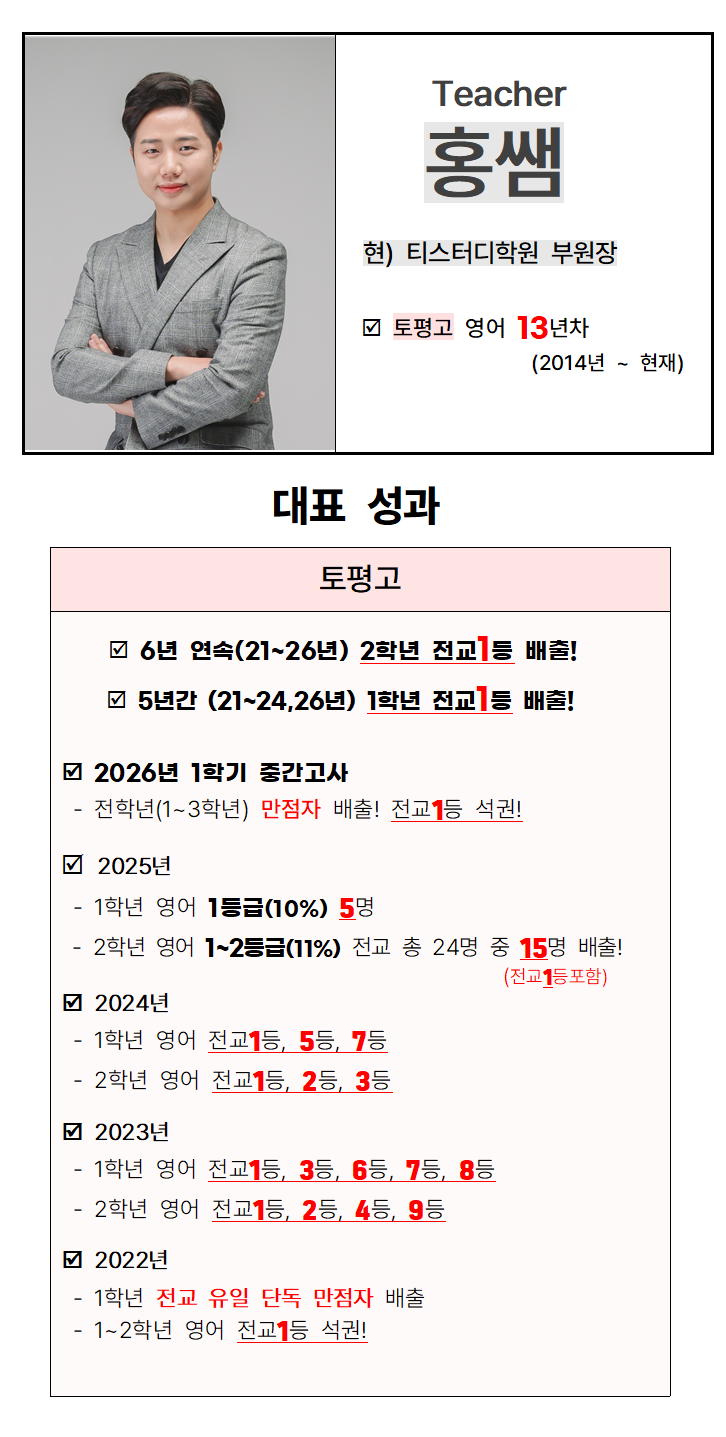 티스터디 학원 부원장 홍쌤입니다 위의 사진 이력에서 보다시피, 현재 구리시에서 토평고 영어내신 성과는 제가 최고라 단언할 수 있습니다. 이번 중간고사 결과 토평고1,2,3학년 전학년 100점 배출! 전학년 영어 전교1등 석권! 토평고 영어를 하는 모든 학원 중에서 전학년 100점은 제가 유일합니다. 더군다나 1,2,3학년 전부 제가 진도수업을 단 1분도 하지 않고 성과를 냈습니다. 오로지 자료와 관리, 딱 2개로만 전교1등을 석권했습니다. 내신 성적은 강사가 수업을 잘해서 점수가 나오는 게 아닙니다. 학생이 스스로 학교에 맞는 자료를 철저한 계획에 따라 공부해야만 점수가 나옵니다. 제 수업의 특징을 정리하자면 1) 진도 수업 하지 않....... <img src="https://blogthumb.pstatic.net/MjAyNjA0MjhfMTEw/MDAxNzc3MzQxNzE0ODkz.ByyuSzaPwOg6PrZ-4lS6Ysv9OwkfGJtcNQjPb-RXuK0g.N1IpgKxiKgCElkiyXCK74OHDFR9_W5AN5y8SFcHCya8g.PNG/image.png?type=s3" />