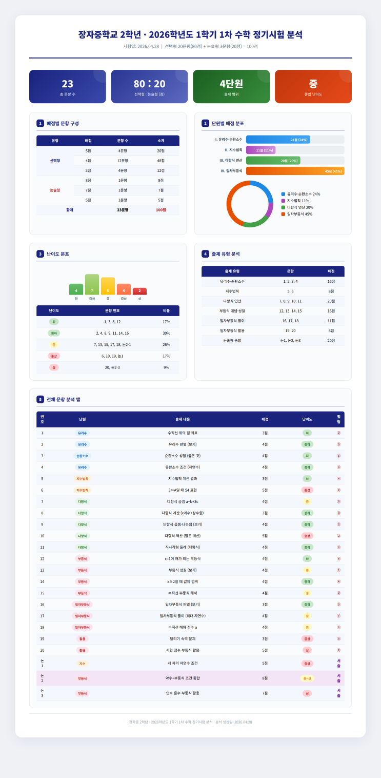 장자중학교 2학년 2026학년도 1학기 1차 수학 정기시험 출제경향 분석 리포트 1. 시험 개요 2026학년도 1학기 1차 장자중학교 2학년 수학 정기시험은 선택형 20문항(80점)과 논술형 3문항(20점)으로 구성되어 총 23문항, 100점 만점이다. 출제 범위는 중2 수학 전반에 걸쳐 유리수와 순환소수, 지수법칙, 다항식 연산, 일차부등식의 4개 단원이다. 전반적인 난이도는 '중' 수준으로 평가된다. 기본 개념 문항이 전반부에 배치되고, 후반부로 갈수록 활용·응용 문항이 집중되어 있으며, 특히 일차부등식 단원이 전체의 45%를 차지하는 압도적 비중이 이번 시험의 가장 큰 특징이다. 2. 배점 구조 분석 선택형은 3점(4문항), 4점(12문항....... <img src="https://blogthumb.pstatic.net/MjAyNjA0MjlfMjA1/MDAxNzc3NDU5NTA5NjA0.3qiaaJ4uE3VYsUJ07vo2VYEGfo_mGOaTz8FAEmP9iFQg.no9jEgbEgIdLai9hzFdKMwpEHIGHBZYsOTCfjEGdmgYg.PNG/dashboard_full.png?type=s3" />