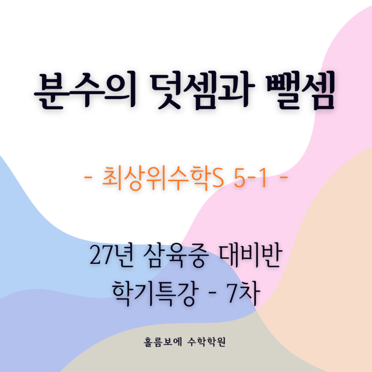 안녕하세요, 구리시 인창동 홀름보에 수학학원입니다. 27년 삼육중 대비반 학기 특강, 일 번째 수업 내용을 돌아봅니다. 수업 내용 ▶ 최상위S 5-1 5. 분수의 덧셈과 뺄셈 ▶ 모의고사 7회 오답풀이 분수를 단위분수의 합으로 나타내는 문제를 다루었습니다. 이때는 분자를 분모의 약수로 나누어 표현하는 것이 핵심이며, 바로 나누어떨어지지 않는 경우에는 크기가 같은 분수로 바꾸어 해결할 수 있습니다. 같은 문제라도 여러 가지 풀이가 가능하다는 점까지 함께 설명했습니다. 두 기약분수의 합과 차가 주어졌을 때 각각의 분수를 구하는 문제도 다루었습니다. 대표적인 합차 유형으로, 초등 저학년 심화에서도 등장했던 개념입니다. 예전에....... <img src="https://blogthumb.pstatic.net/MjAyNjA0MjlfOTAg/MDAxNzc3NDQyMjUzMTg1.uREmewz1_r1OG5DZlFjQ2VCAHtOUAMsnUk6XRKp28MUg.q7VAxWZyA9jmrOOShRzbHfUqYUKs1PncWzwd4P6LN78g.PNG/27%BB%EF%C0%B0%C1%DF%B4%EB%BA%F1%B9%DD_%C7%D0%B1%E2%C6%AF%B0%AD_%287%29.png?type=s3" />
