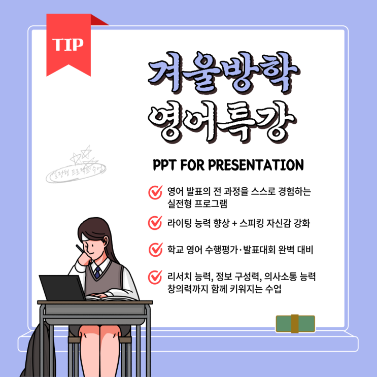 라이팅·스피킹 실력을 동시에 성장시키는 실전형 프로젝트 수업! 아이들이 영어로 발표를 잘하고 싶다면 PPT 만드는 법만 배워서는 부족합니다. ACC어학원의 PPT FOR PRESENTATION 특강은 ‘자료 조사–라이팅–발표’까지 이어지는 진짜 영어 발표 수업으로 영어 발표의 전 과정을 학생 스스로 경험하도록 설계된 실전형 프로그램입니다. 이 수업은 라이팅 능력 향상과 스피킹 자신감 강화라는 두 가지 목표를 동시에 달성하도록 구성되어 있어 중·고등 내신은 물론 앞으로의 학교 프로젝트 교내 발표 대회, 진학 준비까지 확실한 기반이 되는 아주 유용한 프로젝트 수업입니다. PPT PRESENTATION 특강은 무엇이 다를까요? 단순 PPT 만들기 수업....... <img src="https://blogthumb.pstatic.net/MjAyNTEyMDlfMTQz/MDAxNzY1MjcyMTUwNzQ4.ZHrKq_Sb7EeooS44F-CZ4BfmH2B4kuIyO48Q0xKk5dMg.zpJR2GsxzlhzbgVScXZBk5i-OQfBy5feGM53I5rwsakg.PNG/%C1%A6%B8%F1%C0%BB-%C0%D4%B7%C2%C7%D8%C1%D6%BC%BC%BF%E4_-012.png?type=s3" />