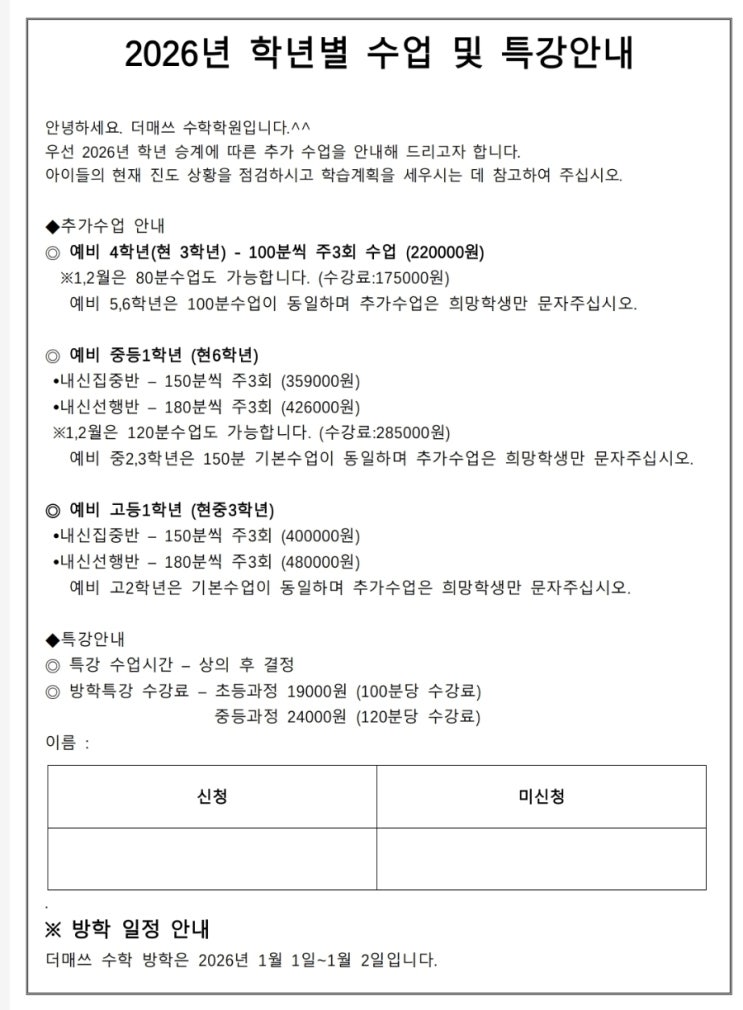 일 년 내내 겨울방학만 기다렸다 해도 과언이 아닙니다. 학생의 부족함을 채우고 발전할 수 있는 백 번, 천 번을 강조해도 부족한 겨울 방학 공부 계획! 초6부터 고2 겨울 방학은 6번이고 일 년이 조금 안되는 기간입니다. 저는 내년이면 이제 17년 차 영어 강사고 다산에서 학원을 운영한 기간은 2년입니다. 송파, 중계, 강남과 매우 가까운 지역이고 주변에 학원이 넘쳐나는데도 학생들이나 학부모님은 고등 선행이 중요하다고만 알고 계시지 고등 선행이 정말 얼마나 중요한지 고등 선행을 언제, 어떻게 시작해야 할지에 대한 고민은 조금 부족하다고 느낍니다. 선행을 하기 전에 예비 중1, 2, 3 학생들에게 꼭 필요한 것은 본인들 인생에서 공....... <img src="https://blogthumb.pstatic.net/MjAyNTEyMTRfMjIx/MDAxNzY1Njk3NTY1Nzc0.D19BqvCPMKAZ14Sn4jYbNOBtdWUjUd-G4Km9pn1-e3cg.3U1Q_nmJaldljtd5yS5Cew3CAdbUJtR-QrDlp9UlULMg.JPEG/%C1%A6%B8%F1%C0%BB_%C0%D4%B7%C2%C7%D8%C1%D6%BC%BC%BF%E4._%287%29.jpg?type=s3" />