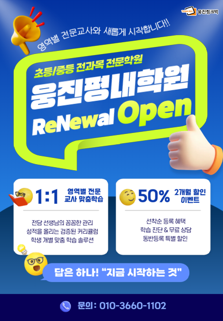 웅진 평내학원 리뉴얼 오픈~~ 안녕하세요. 웅진 평내학원 담당 팀장입니다 새롭게 시작한다는 마음으로 리뉴얼 오픈식을 진행했습니다 선착순으로 50% 할인 진행중입니다 관심 있으시면 언제든지 연락주세요~ 010- 3660-1102 <img src="https://blogthumb.pstatic.net/MjAyNjAxMjJfMTU0/MDAxNzY5MDQ2ODQxMDA2.h3_S1t06R4ySRsknOqiYAEfGQ4qQdlLgygrKZjOH3Mog.2AhuoaR77ZK7WMrx93SkF6XtIX5K5Zy-FY5myRtl24gg.PNG/IMG%A3%DF0556.PNG?type=s3" />