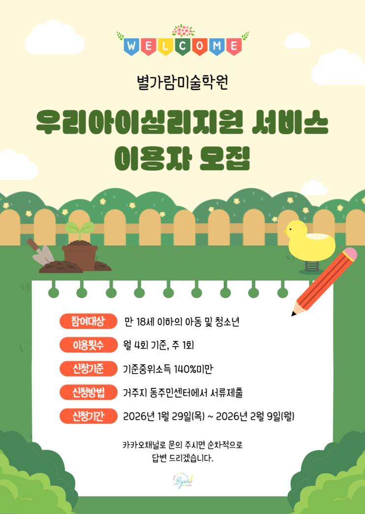 안녕하세요~ 별가람미술학원입니다! 별가람미술학원에서는 2026년 1월 29일 ~ 2026년 2월 9일까지 우리아이심리지원 서비스를 접수하는 기간을 알려드립니다! 주의력 결핍 및 과잉행동장애(ADHD), 사회성 결여, 심리상담 및 정서적 문제 등에 어려움이 있는 아동 및 청소년들에게 우리아이심리지원 바우처를 제공합니다. 소견서, 추천서 필요시 별가람미술학원으로 문의 바랍니다~ 별가람미술학원은 시 교육지원청 지정 교육기관이며 꿈이든카드 사용 가능합니다. 별가람미술학원 070-8831-7238 궁금한신 점이나, 상담문의 언제나 열려있습니다:) 위치 별내 천보 프라자3층 별가람 미술학원 시간표 인스타그램 블로그 카카오채널 상담문의 기사 <img src="https://blogthumb.pstatic.net/MjAyNjAxMjJfMjUz/MDAxNzY5MDcwNjk4MzM0.WCAZyYUUEoHKpqXrO0d2neOmMuwfkTsRuRKyVqgrDaMg.pA0wBo6QQPOhIjxynToqtOOnXNul5qHxH3EZ-kV0JxMg.PNG/%BF%EC%B8%AE%BE%C6%C0%CC%BD%C9%B8%AE%C1%F6%BF%F8%BC%AD%BA%F1%BD%BA%BE%C8%B3%BB.png?type=s3" />