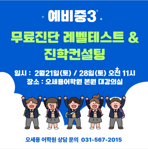 안녕하세요. 오세용 어학원입니다. 많은 학생들이 이렇게 이야기 합니다. 중학교때 영어 잘했어요~~ 라고 고등 영어는 중등 영어와 달리 암기만으로 버틸수 없고, 한번 무너지면 회복하기 쉽지 않은 과목입니다. 고등영어는 중등영어 단어 수에서 2~3배가 증가되고, 지문의 길이가 길어지며, 내신에서는 서술형과 변형문제들이 폭증하여 난이도가 급상승합니다. 지금 우리 아이가 문장 구조를 정확히 해석하는지... 어휘를 암기한다가 아니라 이해하는지... 그리고 고등 지문을 끝까지 읽어낼 체력이 있는지 진단해보는것이 좋습니다. 오세용 어학원에서 예비중3 학생들을 대상으로 무료진단 레벨 테스트를 진행합니다. 중등 실력 점검 고등 진학....... <img src="https://blogthumb.pstatic.net/MjAyNjAxMjNfMTY1/MDAxNzY5MTUyOTk1NTQ1.QyRo8KGtdPGWVmNtj5ZTTdkxbS8_ve8QjBNsdTzI4cEg.1stmJLdRNBg-f8Lg0dsob2rE-I8z_NuSlYFmpm_bIfwg.PNG/%C8%AD%B8%E9_%C4%B8%C3%B3_2026-01-23_160650.png?type=s3" />