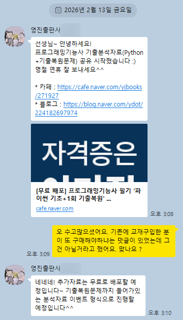 안녕하세요. 한다맨입니다. 가족들과 여행 중에 톡이 왔습니다. * 카페 : https://cafe.naver.com/yjbooks/271927 * 블로그 : https://blog.naver.com/ydot/224182697974 프로그래밍기능사필기 시험을 준비하는 분들에게 도움이 되기를 바랄게요. 행복한 명절 연휴 보내세요~ ! #프로그래밍기능사필기기출문제 #프로그래밍기능사파이썬 #파이썬 #한다맨쌤 #영진출판사 #이기적프로그래밍기능사필기 <img src="https://blogthumb.pstatic.net/MjAyNjAyMTVfOTYg/MDAxNzcxMTI3NjA3NzM5.dJ9OcPXLjngqRwJnG81rOZja0unhrtTtUuGg1aqOwpUg.S5DPyIx8wGbqS5BFVvqOdni7l062UnPnSVSDSUWccFIg.PNG/image.png?type=s3" />