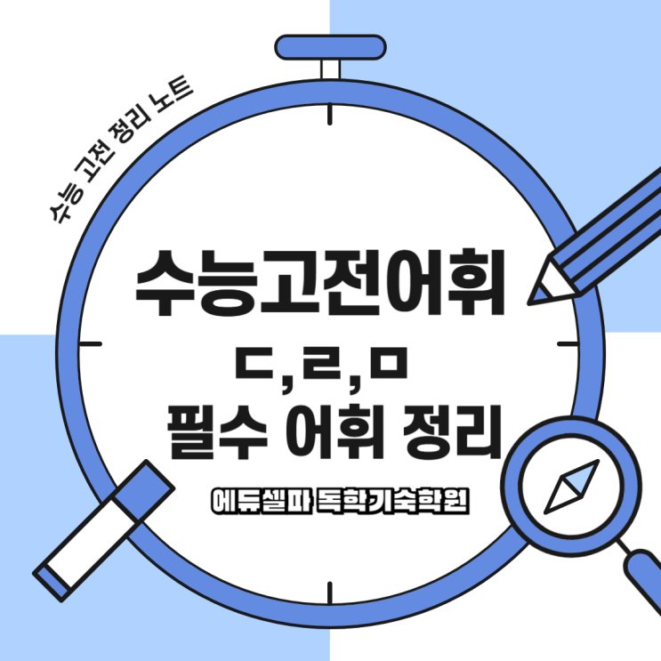 안녕하세요. 에듀셀파 독학기숙학원 하린쌤입니다. 수능을 준비하는 학생이라면 반드시 정리해야 할 영역이 있습니다. 바로 수능고전문학어휘입니다. 많은 학생들이 고전 문학을 어려워하는 이유는 내용이 아니라 ‘낯선 단어’ 때문입니다. 단어가 막히면 문장이 멈추고, 문장이 막히면 지문 전체가 흐릿해집니다. 그래서 오늘은 <ㄴ> 시리즈에 이어, 수능에서 반복적으로 등장하는 수능고전문학어휘 <ㄷ·ㅁ·ㅂ> 시리즈를 정리해보겠습니다. 도화(桃花) – 복숭아꽃 도화는 고전 문학에서 가장 중요한 꽃 중 하나입니다. 복숭아꽃을 의미하는데, 고전문학에서는 화자가 지향하는 이상향인 '무릉도원'을 암시하는 장치로 많....... <img src="https://blogthumb.pstatic.net/MjAyNjAyMThfMTk1/MDAxNzcxNDIxNTA3Njk5.REjn1F4VzwgPO1aPIwJvyY6rldRNM7R--qXAgoJ7OJAg.Lk7aS-zQDRC8PTWxADeyhA4x6CTDpr8Rwsp0VH3CX58g.PNG/%BC%F6%B4%C9%C6%AF%B0%AD__%BA%B9%BB%E7%BA%BB-001_%2853%29.png?type=s3" />