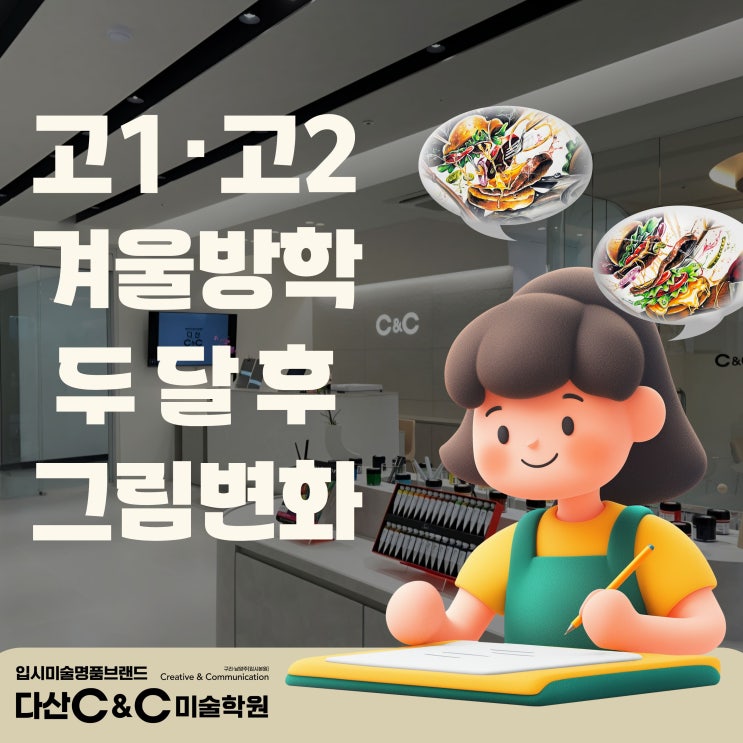 안녕하세요! 구리·남양주 미술학원 다산 C&C입니다! 오늘은! 겨울방학 두달동안 진행된 다산 씨앤씨 고등 예비반의 겨울방학 수업 마무리 이야기를 전해드리려고 합니다! 처음 시작할 때만 해도 "내가 잘 할 수 있을까?" 하며 두려운 표정으로 앉아 있었던 학생들이 이제는 스스로 구도를 잡고, 스케치를 시작하고, 채색까지 완성해 나가는 모습으로 바뀌었습니다 :D ☃️겨울방학의 추억들 쉬는 시간마다 간석 먹으며 이야기를 나누고, 구도가 막히면 옆 친구와 함께 고민도 해보고, 선생님 자리로 몰려와 채색 방법을 물어보고, 완성하면 서로 먼저 보여주려고 들고 오던 모습들. 샌드위치를 나눠 먹던 날도 있었고, 늦게까지 남....... <img src="https://blogthumb.pstatic.net/MjAyNjAzMDdfNzMg/MDAxNzcyODYzNTg3NTM3.TTcvSB-_88XDAMv6sV-y6-wGVXZPCNQXOuq8sIpngxAg.-BvpY6KxgNjGuR-yW7Z93qAyxMr6sLqwXrlhiU6tTrIg.JPEG/%C1%A6%B8%F1%C0%BB_%C0%D4%B7%C2%C7%D8%C1%D6%BC%BC%BF%E4._-_2026-03-07T150559.834.jpg?type=s3" />
