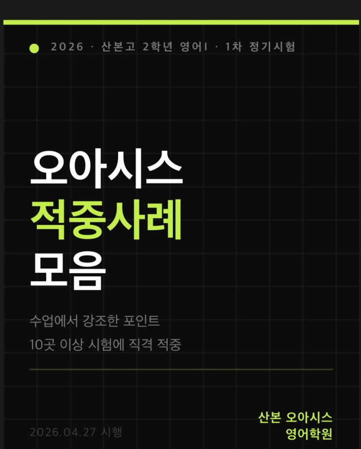 이번 산본고등학교 2학년 영어I 1차 정기시험은 선택형 19문항(80점)과 서답형 5문항(20점)으로 구성되었습니다. 특히 서답형 5문항 전부가 교과서 Lesson 2와 Jeju 외부지문에서 출제되어, 단원 학습의 깊이가 점수를 결정했습니다. 산본고 2학년 영어 선택형 19문항 중 3월 모의고사 지문이 15문항을 차지했습니다. 수능형 유형이 전면 배치된 구성입니다. 산본고 2학년 영어I 교과서 Lesson 2는 서답형의 핵심 출처입니다. 논술형 2·3·4·5번이 모두 이 단원에서 출제되었습니다. 산본고 영어 이번 시험에서 Jeju Island 외부지문은 3·4번(선택형) + 논술형 1번(서술형)에 걸쳐 출제되었습니다. 산본고등학교 2학년 영어 선택형의 대부분은 3월....... <img src="https://blogthumb.pstatic.net/MjAyNjA0MjdfMjEw/MDAxNzc3MjkxNDk3MDMx.0Q6ZMuh7-gQRu_KakHAsdqCvHSJK-JWFxT_ByFp9IpQg.apUWAlZUO-E_-pTZiUfLMUQWUimiZhzZSCYzV_wbWKYg.JPEG/KakaoTalk_20260427_210352390.jpg?type=s3" />