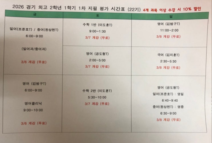 경기외고 22기 지필고사 시간표 0. 학생들은 알고 있습니다. 경기외고 2학년 내신을 제대로 봐주는 학원은 공감뿐인 것을요. 1. 경기외고 내신은 공감에서 끝냅니다. 국, 영, 수, 일, 중, 통과, 통사 2. 모든 과목 최소 2개 이상 반 세팅. 학생 스케줄에 맞춰 조합형 수강 가능. 있는 반에 맞춰 다니는 구조가 아니라 학생 일정에 학원이 맞춥니다. 3. 영어만큼은 학생의 니즈에 맞게 가르쳐야 합니다. - 금요일반: 김범구 선생님 - 일요일반: 공도형 선생님 4. 공감영어 콘텐츠는 경기외고 13년 경력 공도형 원장님, 서울대 영교과 최우등 졸업, 이투스 영어 대표강사 김범구 선생님, 서울대 영교과 졸업 이지명 연구원, 이 세 명의 강사가 오직....... <img src="https://blogthumb.pstatic.net/MjAyNjAyMDNfMyAg/MDAxNzcwMDgyMTI1NjEy.2xc7auLOtVXRGhbbrQIPV13cU_JvwgfGFt1zrIgyQUkg.RizS5Yenotx0W8r12lrUslNQh6xyy2-4nenw-bVVwFAg.JPEG/900%A3%DF1770081874248.jpg?type=s3" />