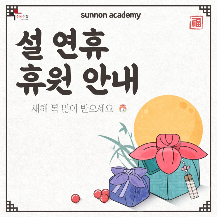 안녕하세요 수논수학 학원입니다 겨울방학과 설날이 겹치는 시기인 만큼 우리 학생들이 잠시 쉬면서도 다시 힘차게 달릴 수 있는 에너지를 채우길 바랍니다. 수논수학도 설을 맞이해 잠시 쉬어갑니다 2월 17일(화)~18일(수) 학원을 열지 않으니 전화 및 방문에 차질이 없길 바랍니다 ※월요일은 학원 정기휴무입니다 휴식은 재충전을 위해, 공부는 흐름을 위해 이어가주세요! 행복한 명절 보내시고 저희는 목요일에 만나도록 할게요 :) <img src="https://blogthumb.pstatic.net/MjAyNjAyMTBfNTYg/MDAxNzcwNzEwNTkwNjQ0.TuTiuRhGx3tgP-LEeGlWIp-kQSqnHAd1n7ZxXNHqJhgg.3o67d-AgrlEaWkc_Ku_18SyFv8BbB2pfp0gBCMDWLe0g.JPEG/%BC%B3_%BF%AC%C8%DE%28%BD%E6%B3%DA%29.jpg?type=s3" />