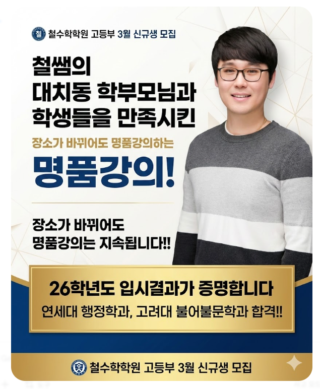 안녕하세요!! 철수학 철쌤입니다!! 26학년도 고등부 3월 신규생 모집안내합니다!! 대치동의 열정과 실력을 그대로 이어가는 철수학학원입니다. 새 학기의 시작인 3월을 맞아, 우리 아이들의 수학 실력을 확실하게 책임질 고등부 신규생 모집 및 입학 테스트 소식을 전해드립니다. 입시 결과로 증명된 철수학만의 명품 강의를 이제 새로운 곳에서도 만나보세요! 2026학년도 입시 결과가 증명합니다! 장소가 바뀌어도 강의의 본질과 결과는 변하지 않습니다. 대치동 학부모님과 학생들을 매료시켰던 '철쌤'의 강의가 산본에서 오픈 2년만에 놀라운 결과를 만들어냈습니다. 연세대학교 행정학과 합격! 고려대학교 불어불문학과 합격....... <img src="https://blogthumb.pstatic.net/MjAyNjAyMTJfMjIx/MDAxNzcwODYyNTYyMzQz.zXFVj8h8ZVWbL_hFb6t_sgftOqShpZOgOe0lYlgc9RQg.z-d-5XL4gAEXLFf3hxCq86mw1FZSMZrO7wRzzki7ukMg.PNG/image.png?type=s3" />