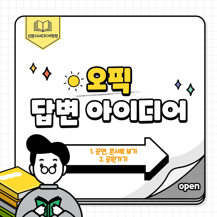 안녕하세요 산본오픽학원 산본시사EJC어학원입니다 오늘은 오픽시험 답변 아이디어를 알려드리려고 합니다 ! 각 주제를 학습하신 후 해당 주제의 문제와 답변을 더 많이 익혀두면 어떤 문제가 나와도 쉽게 답변하실 수 있습니다 오늘 2개의 주제로 답변 아이디어를 알려드릴테니 시험장에서 도움이 되셨으면 좋겠습니다 (TIP. 답변 아이디어를 활용해 여러분들도 직접 답변을 작성해보세요 !) 그럼 들어가볼까요? 오늘의 첫번째 주제는 '공연, 콘서트 보기' 입니다. 첫번째 질문은 '주로 어떤 콘서트에 가나요? 그 이유는 무엇인가요?'입니다. '주로 어떤 콘서트에 가나요?' 라는 질문에는 'I usuall....... <img src="https://blogthumb.pstatic.net/MjAyNjAyMTNfODkg/MDAxNzcwOTgxMTY0MzEz.CBtXtxjJ9jEAuHRPpZZjOSx2IrVxQZr2BBTIHJRR3Nkg.l635qUIwL0ExHBVCJCAr-uzhsROA0ctHc7WxYLF_7eQg.PNG/001.png?type=s3" />