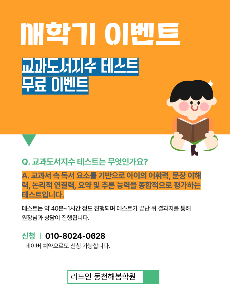 [리드인 용인 동천해봄학원] 새 학기 교과도서지수 테스트 무료 이벤트