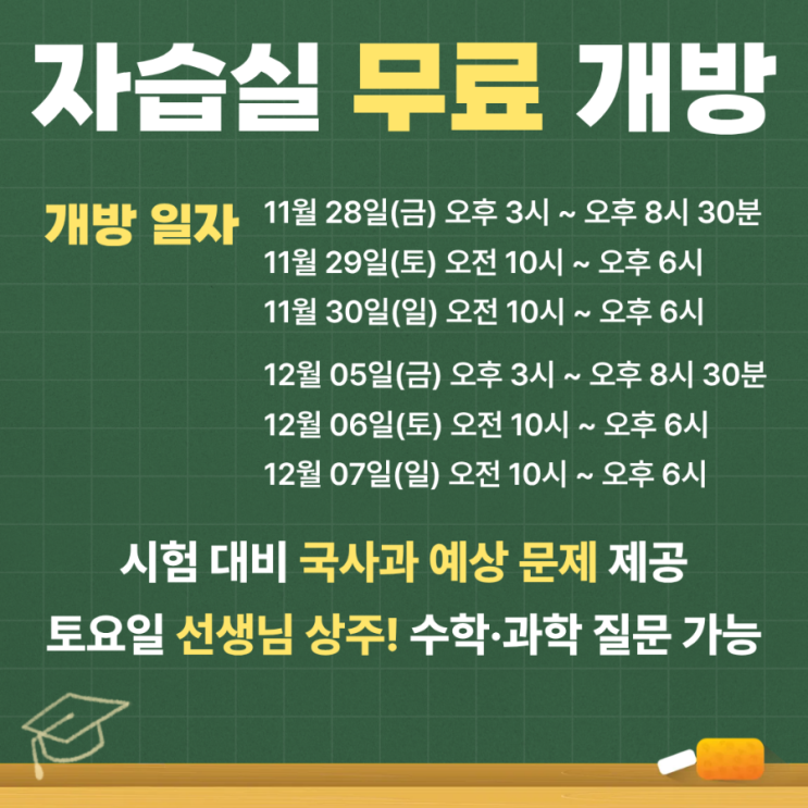 나곡중 내신 대비 자습실 개방 + 국·사·과 예상문제 제공 안내 나곡중 내신이 다가오면 아이들 마음속엔 조용히 파도 같은 긴장이 밀려옵니다. 우리 학원은 그 파도를 잔잔하게 만드는 전용 내신 대비 시스템을 이번 시험에도 오픈합니다. 1. 나곡중 전용 자습실 무료 개방 내신 기간 동안 금토일 출입 가능한 조용한 자습 공간 수학 과학 과목별 질문 가능(토요일2시~6시) 아이들이 “공부 장소 찾느라 시간 낭비” 하지 않도록 집중 존을 마련했습니다. 2. 국어·사회·과학 예상문제 나곡중 기출 흐름을 분석해 국어 문학·비문학 핵심 출제 포인트 예상문제지 제공합니다. 실제 시험처럼 풀어봄으로써 시험장에서 흔들리지 않는....... <img src="https://blogthumb.pstatic.net/MjAyNTExMjhfMjgz/MDAxNzY0MzI5NTUzNjk5.bl0TgLBo8dZkvVLULdjWZDDifmsUCl62uiy32p7_tpkg.yXeJjNEl5ic1NyzygiqnhZGjQElwdTo4XtRJxRYE8asg.PNG/900%A3%DF1764234760195.png?type=s3" />