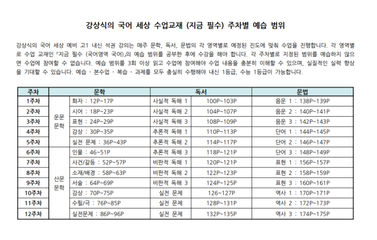 국어세상 주차별 예습범위
