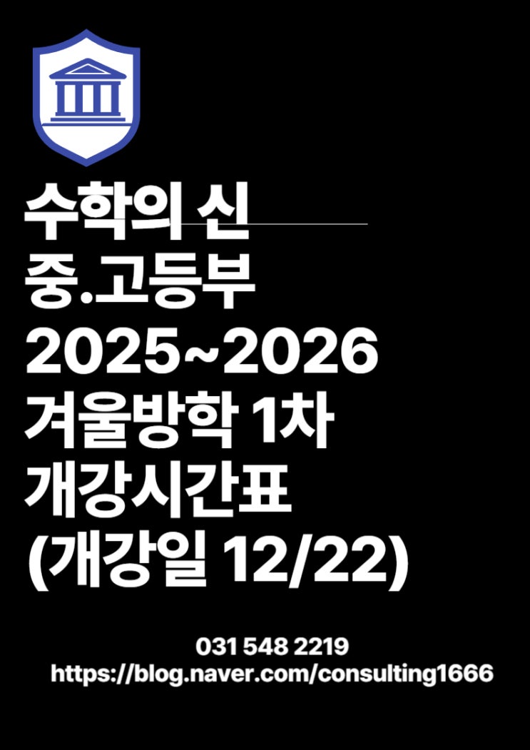 중등부 2025~2026 겨울방학 1차 개강 시간표 : 개강일 12월 22일 (현재 개강 확정반/2차 개강은 방학이후 2026년 1월 9일 (금)) 고등부 2025~2026 겨울방학 1차 개강 시간표 수학의 신 전격 공개! 성적을 끌어올리는 두 개의 전문 반 Master 神 Class / Rise 神 Class 안녕하세요, 수학의 신입니다. 많은 학부모님들께서 상담 오실 때 가장 많이 하시는 말이 있습니다. “우리 아이가 지금 단계에서 어떤 관리가 필요한지, 그리고 성적이 정말 올라갈 수 있는지 알고 싶어요.” 그래서 수학의 신은 단순한 레벨 분반이 아닌, 성적 향상 구조 자체가 설계된 전문 반 체계를 만들었습니다. 그 이름이 바로, ✨ Master 神 Class ✨ Rise 神 Cla....... <img src="https://blogthumb.pstatic.net/MjAyNTEyMDhfOTUg/MDAxNzY1MTg2NTI3Mjcw.0cpc4Z8nIqaTgl3YLZgvWmQpeWoPweO7ZDvvEnWNQRkg.yrMHCYD5mXVBL9Fuk6NAXLBrOPEWA7u5P344UvDDDo0g.JPEG/%C1%A6%B8%F1%C0%BB_%C0%D4%B7%C2%C7%D8%C1%D6%BC%BC%BF%E4_-001_%285%29.jpg?type=s3" />