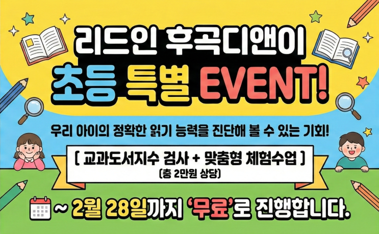 안녕하세요. 아이들의 생각하는 힘과 올바른 독서 습관을 길러주는 리드인 [후곡디앤이국어논술] 입니다. 새 학기를 앞두고 아이의 독서 교육, 어떻게 시작해야 할지 막막하신가요? 요즘 '문해력'이 중요하다는 이야기는 정말 많이 들리는데, 정작 우리 아이가 책을 제대로 읽고 있는지, 교과서는 잘 이해하고 있는지 불안한 마음이 드실 겁니다. 좋다는 책을 무턱대고 많이 읽히는 것만이 능사가 아닙니다. 아이에게 맞지 않는 옷을 입으면 불편하듯, 수준에 맞지 않는 책은 오히려 독서에 대한 흥미를 떨어뜨립니다. 독서의 첫걸음은 '정확한 진단'에서 시작되어야 합니다. 리드인 후곡디앤이 초등 특별 EVENT! 우리....... <img src="https://blogthumb.pstatic.net/MjAyNjAyMTNfMjU2/MDAxNzcwOTQzNzE0NjI2._35QU84Hr665meR1hhQImDqHaa8ew3yWanwkpxnB7hMg.sfY-XYzmvWWBXoFMEBcXb7-h6Xj6p2K_eJiGkPCbuasg.PNG/%B8%AE%B5%E5%C0%CE5.png?type=s3" />