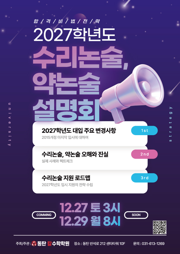 안녕하세요 1동탄 수학학원 칼수학학원 입니다. "수리논술, 약술논술.... 도대체 언제부터, 어떻게 준비해야 할까요?" 매년 상담을 하다 보면 학부모님들께 가장 많이 듣는 질문입니다. 입시 제도는 매년 바뀌고 특히 수리논술이나 약술형 논술은 혼자 준비하기가 막막한 분야죠 특히 2027학년도 대입은 수능&내신과 함께 수리논술·약술논술의 중요성이 더 커지는 시기라 막연한 불안감으로 찾아오시는 학부모님과 학생들이 정말 많습니다. 그래서 동탄 칼수학학원에서는 2027학년도 수리논술·약술논술형 설명회를 준비했습니다. ✨이런 분들께 추천드립니다✨ ⤵⤴ ✔ 수리논술과 약술논술의 차이조차 헷갈리는 경우 ✔ "우....... <img src="https://blogthumb.pstatic.net/MjAyNTEyMTdfMzEg/MDAxNzY1OTcyOTA0MjMz.xrgTEw9iV51Pdb9ADTBbbfYKT3-NqGQKqBqEU34ISNgg.VIL8YH_5TXnqOPEggmcDCKhdXKn-_4paSLKDdDlqZFEg.JPEG/%BC%F6%B8%AE%B3%ED%BC%FA%B0%B3%B0%AD.jpg?type=s3" />