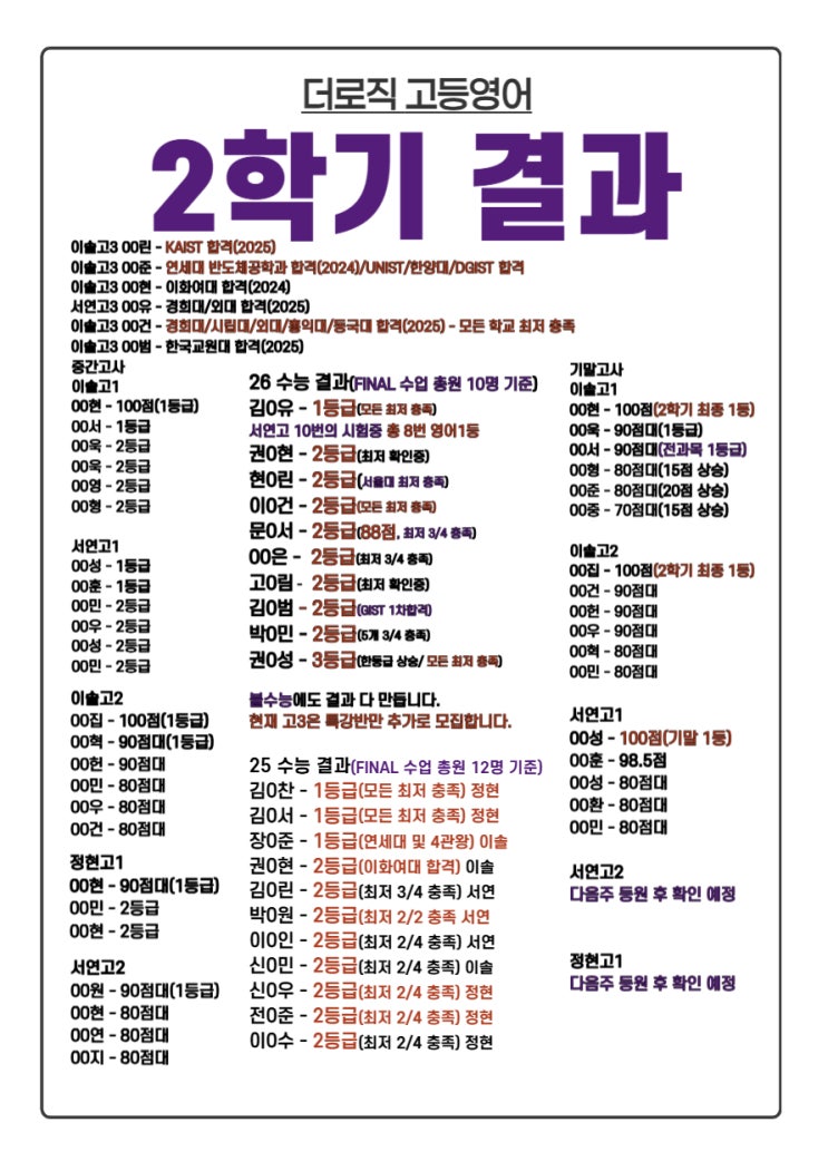 2학기 결과 우선 보고드립니다. 서연고2/정현고1은 아직 반영 못했습니다. 다음주에 아이들 등원하고 결과에 전부 반영해놓겠습니다. 기말고사 기준 이솔1, 이솔2, 서연1 - 확실하게 100점 나왔으며 이솔고1, 이솔고2 - 중간, 기말 최종 1등확정 이솔고3 - 카이스트 합격 서연고1 - 기말고사 100점 학생은 나왔습니다. 올해를 마치며-------- 한번이라도 이 학원에서 제가 하는 노력들을 봤다면, 제 마음을 알아줄꺼라고 믿습니다. 모든 사람을 만족시키는 강의는 할 수 없다고 생각합니다. 그저 제 자리에서 최선을 다하면 된다고 생각합니다. 올해도 정말 많은 학생들이 학원에서 배워주었고, 저에게 기회를 줬다고 생각합니다. 그 자체만으로....... <img src="https://blogthumb.pstatic.net/MjAyNTEyMThfODYg/MDAxNzY2MDUxNjg1ODQ1.9sgJyHq5vv8_2Xp7d7X4222BGxb4i4GhdIaYiGY02ycg.9b8nMIl7rkdBcbMCgahtjterlDeTFQ8B961rnKtWzgsg.JPEG/%C1%A6%B8%F1%C0%BB_%C0%D4%B7%C2%C7%D8%C1%D6%BC%BC%BF%E4_-002_%2819%29.jpg?type=s3" />