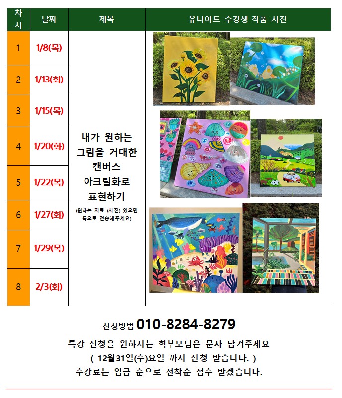 거대한 캔버스 (사이즈 20호 73x61cm) 완성하기! 소장가치가 있는 나만의 작품을 완성하여 작가적 예술활동을 경험 합니다. 큰 캔버스 작업으로 성취감과 자신감으로 아동기에만 담을 수 있는 나만의 느낌을 담아보아요! 오직 특강 수업에서만 할 수 있는, 행복한 예술활동을 아이들에게 선물해주세요! ※ 대 상 : 초등학생 1학년~중학생 (선생님 한분당 5명 정원으로 선착순 10명만 받습니다.) ※ 수업 시간 : 오전 11:00 ~12:30 1회 1시간30분 수업 진행/ 수강료 : 18만 (재료비 포함) ※ 날 짜 : 2026년 1월 8일(목) ~ 2월 3일(화) 총 8회/ 한달 동안 화,목요일만 진행) *방학특강은 외부 친구들도 신청 가능합니다. <img src="https://blogthumb.pstatic.net/MjAyNTEyMTlfMjE2/MDAxNzY2MTE5Njk2NTYx.KWRzoZb8DAd90ZLkaIrO_zIb2zqXk0qX9K5WR2LHU8Yg.9Kblsk5r6Ht1q0Eg11CoFcXfwhWI-pHhKj8odhHG8bog.JPEG/KakaoTalk_20251216_140750557.jpg?type=s3" />