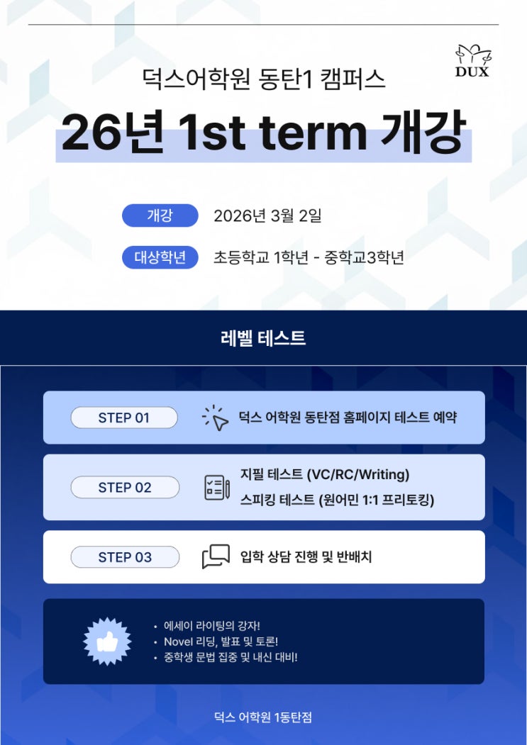 안녕하세요, DUX 덕스어학원 1동탄캠퍼스 입니다. 날이 점점 풀리고 어느덧 3월이 다가오고 있습니다. 새학기를 앞두고 학부모님들께서도 아이의 한 해를 어떻게 준비해야 할지 고민이 많으실 시기입니다. 학년이 바뀌는 지금은 단순한 시작이 아닌, 한 해의 학습 방향과 성취도를 결정짓는 매우 중요한 출발점입니다. 첫 단추를 어떻게 끼우느냐에 따라 1년의 흐름이 크게 달라질 수 있습니다. 이 중요한 시기에 맞춰, 덕스어학원 1동탄캠퍼스의 2026년 1st term 새학기가 3월 2일(월) 시작됩니다!! 새 학년, 새로운 목표, 보다 체계적인 커리큘럼과 꼼꼼한 관리로 내 아이의 1년을 안정적으로 설계하겠습니다. 새학기, 이렇게 시작하면 다릅니....... <img src="https://blogthumb.pstatic.net/MjAyNjAyMTNfMTc5/MDAxNzcwOTcwNjQ1NDM0.ZnaGiZQMawBJ_1f5b52EhIjwfZ2zzAIO0Ms-iIoyegIg.2XzkXrLiYPO9d5myoW6yyw-8YKS1vSEzF3jAcDrzAS4g.JPEG/KakaoTalk_20260213_115024826.jpg?type=s3" />