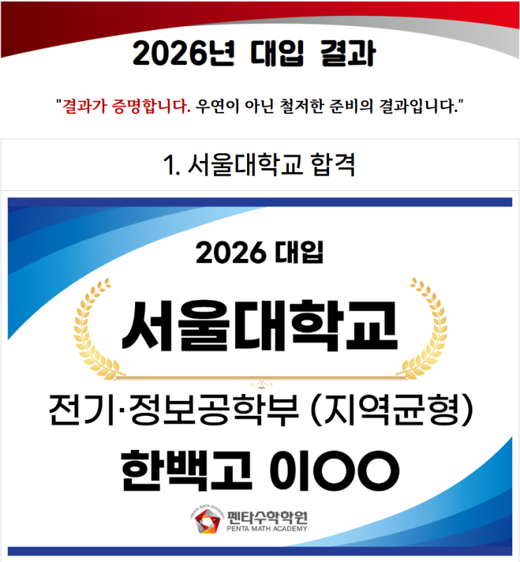 [수학은 펜타처럼!] 2026년 대입결과 서울대 1명, 연세대 2명, 고려대 1명, 의치한수약 5명, 수리논술 28명 !! 최상위권 대학 [교과,종합,정시] 40명이상 합격 !!