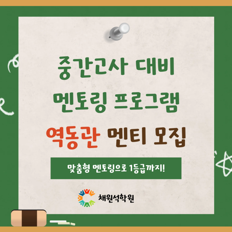 안녕하세요. 채원석학원입니다! 이번 중간고사 대비기간에 역동관에서 멘토링 프로그램을 진행합니다. 혼자 공부하다 보면 공부 방향이나 방법에 대해 고민이 생기기 마련입니다. 멘토링 프로그램은 이전에 공부하던 방법보다 더 효율적인 학습 방향을 찾을 수 있도록, 학생들을 돕기 위해 선생님들이 직접 멘토가 되어 학생들을 관리하는 프로그램입니다. 멘토와 함께 - 학습 목표 설정 - 꾸준한 공부 습관 형성 - 실천 가능한 학습 계획 수립 - 개인 맞춤형 피드백 제공 위를 통해, 보다 체계적인 학습 관리가 이루어집니다. 진행방법은 다음과 같습니다. 1) 하단 네이버폼을 통해 멘토링 프로그램 신청 (인적사항을 정확하게 적어주시기 바랍....... <img src="https://blogthumb.pstatic.net/MjAyNjAzMTdfMTk1/MDAxNzczNzMxMDE3NjY3.U4wKHoQ5SfpFHwgntbMZ8cJsR3icZOyajBFBtZyccoAg.08AaCVAhTUut08PFl25AfXdzqQfiC9bj8YnDDrC75Jcg.PNG/1.png?type=s3" />