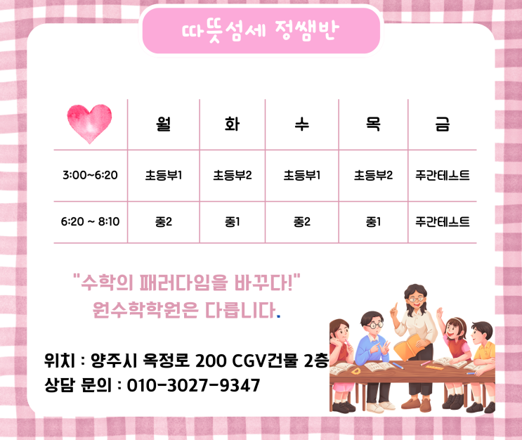안녕하세요 학생 그리고 학부모 여러분, 원수학학원입니다. 날씨가 풀리는 듯 하더니 다시 추워지기를 반복하며 날씨가 변덕을 부리고 있습니다. 다들 건강 조심히 잘 지내고 계신가요? 저희 원수학학원에서는 따뜻한 봄이 오면 새하얀 겨울과 아쉬운 작별인사를 하고 새로운 시작을 맞이하듯이 선생님 한 분과 아쉬운 이별을 하고 새로운 선생님을 모셨습니다. 새로 오신 선생님께서는 아이들에게 항상 따뜻하게 대해주시고 차분하게 수학의 재미를 알려주시기 위해 노력해주시는 상냥하신 분입니다. 아이들의 수학 성적 상승만을 신경쓰는 것이 아닌 아이들의 내면의 성장까지도 옆에서 지켜보고 도와주고 싶은 만큼 심사숙고해서 좋은 분을 모....... <img src="https://blogthumb.pstatic.net/MjAyNjAzMTNfNjEg/MDAxNzczMzgwMjYyNDk0.0VKh46NFA07jTVgAylysfm73lRYsSYlibDBHg0I0o6sg.qdQtzoCXH8WrBI4R5edDW-SIhg-2yzJ9PB_xZg0kg1Yg.PNG/image01.png?type=s3" />