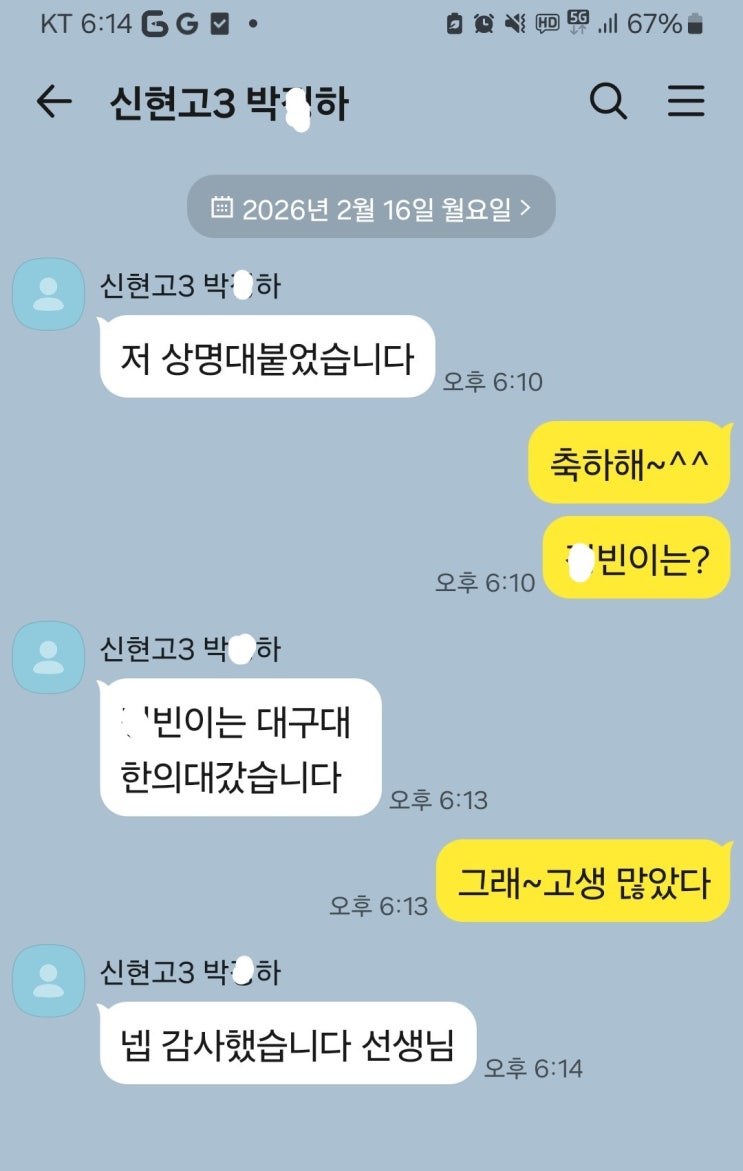 서울에서 가르친 학생 중 한 명이 대구대 한의학과에 합격했습니다. 이처럼 기쁜 소식 때문에 늘 열심히 가르치게 됩니다. <img src="https://blogthumb.pstatic.net/MjAyNjAyMTZfMTIw/MDAxNzcxMjM0MTgxNDg1.1DbXo6-6Ene9CliUB6qOSJlD_Cm7x9TKO2w6xvFwHGgg.Jevpzfw7fcNT1KlpI3HNkg1GiQzJzBgXWcVb-K1NdzQg.JPEG/KakaoTalk_20260216_181925467.jpg?type=s3" />