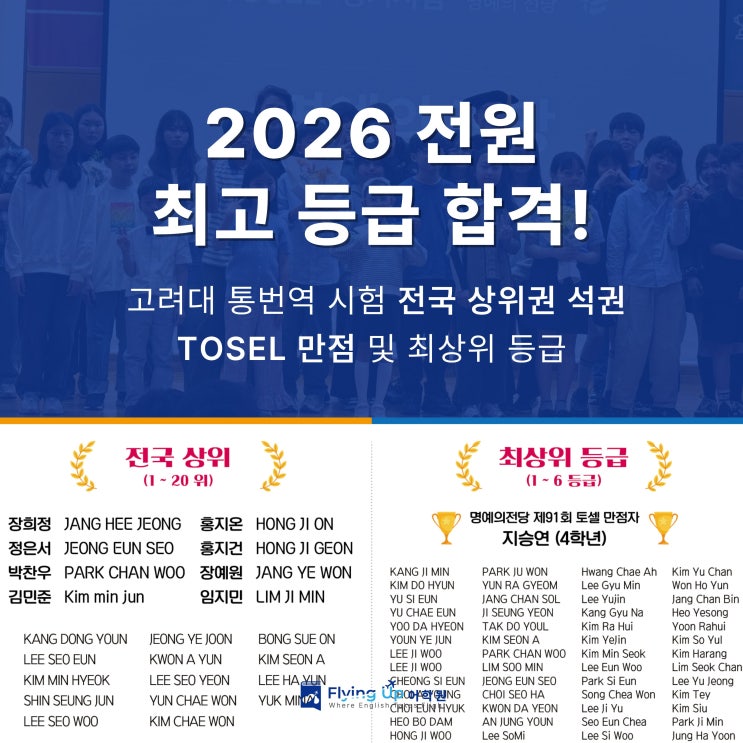 토플 만점과 KUT 영어 고려대통번역시험 전국 상위 석권_천안영어플라잉업어학원