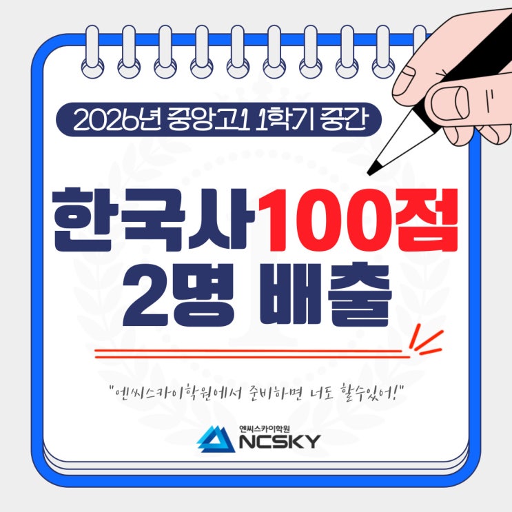 중앙고등학교 1학년 학생들의 첫 중간고사가 마무리되었습니다. 고등학교 입학 후 치른 첫 시험이라 긴장감이 컸을 텐데, 벌써부터 기분 좋은 소식이 들려오고 있어 공유합니다. 2026년 중앙고1 1학기 중간고사 한국사 '100점' 배출! 가채점 결과, 엔씨스카이학원 재원생 중 무려 2명의 학생이 한국사 만점(100점)을 기록했습니다! 고등 한국사는 중학교 때와 달리 암기량도 방대하고 사료 해석 문제까지 까다롭게 출제되기에, 완벽한 점수를 받는 것이 결코 쉽지 않습니다. 하지만 우리 학생들은 학원의 체계적인 커리큘럼과 본인들의 노력을 더해 최고의 결과를 만들어냈습니다. ✅ NCSKY만의 만점 비결 교과서 완벽 분석: 단 한....... <img src="https://blogthumb.pstatic.net/MjAyNjA0MzBfNzIg/MDAxNzc3NDgyNjI3MjQ4.LWRQmEcF8Py1_oFOirYxkN6MejqjZZrhaGAUsuMvdwYg.X-nkCRbBcmymXSKwh7u5oXkW1t6AljUkhi7Eiz4HaZsg.JPEG/015.jpg?type=s3" />