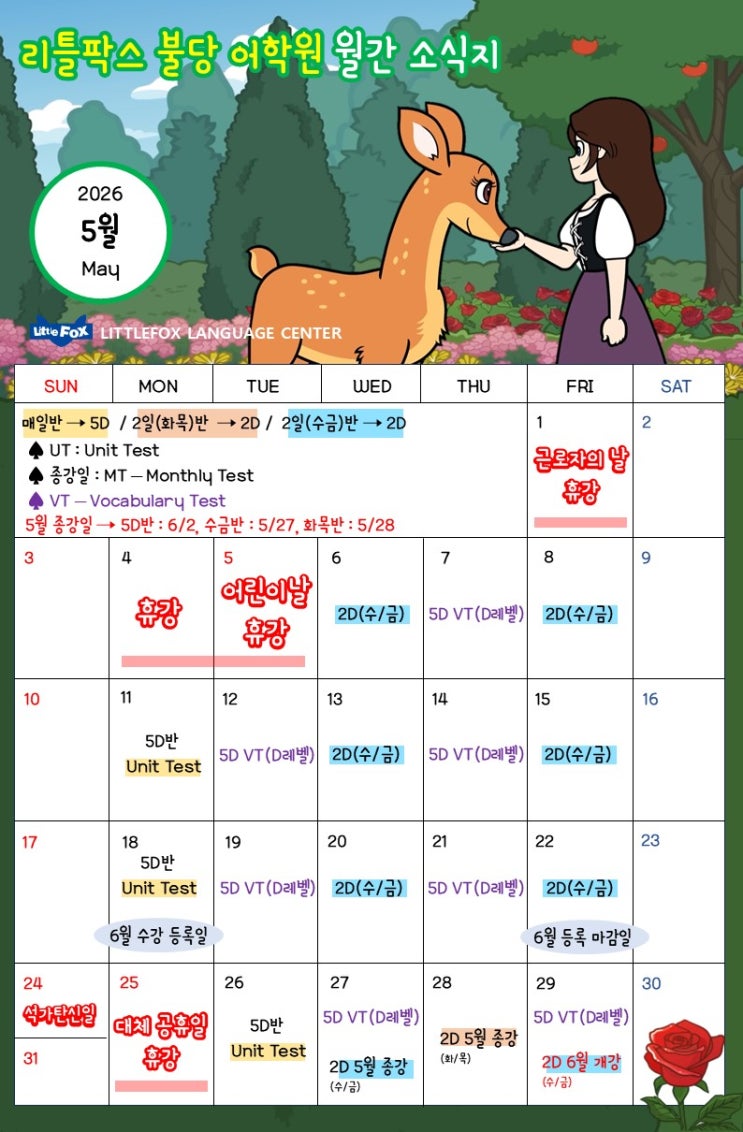 리틀팍스 불당 어학원 5월 소식을 안내드립니다 휴강일을 미리 확인하시어 스케줄에 불편함 없으시기를 바랍니다 *^^* ◎ 5월 개강일 ~ 종강일 안내 ◎ * 매일반 : 4월 30일 ~ 6월 2일 * 수금반 : 4월 29일 ~ 5월 27일 * 화목반 : 4월 30일 ~ 5월 28일 5/1(금) - 근로자의 날 휴강 5/4(월) - 휴강 5/5(화) - 어린이날 휴강 5/25(월) - 임시공휴일 휴강 ※휴강일은 수업일수, 수업료에 포함되지 않습니다 ※ :: 리틀팍스 불당 어학원 :: <img src="https://blogthumb.pstatic.net/MjAyNjA0MjBfMTc4/MDAxNzc2NjY0MzIxODUx.wPseb57W2tRuBOlG_TbYSGwjSIMn2JqSuEX6y3sOq0wg.0vC8RKruSvrGLZVW4rNUfLQ-gReYSMuE8676OUj5M1gg.JPEG/2026%B3%E2_5%BF%F9_%BF%F9%B0%A3%BC%D2%BD%C4%C1%F6.jpg?type=s3" />