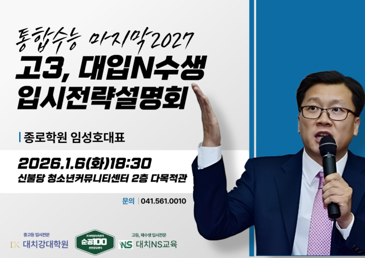 [천안] 2027 대입의 핵심! 종로학원 임성호 대표 초청 입시전략 설명회 (선착순 70명 무료) 안녕하세요! 천안 최고의 교육 파트너 대치강대학원(중고등 연합단과) / 순공100(프리미엄)독학관리 / 대치NS교육(재수생단과전문) 입니다. 2027학년도는 '통합수능의 마지막 해'로 그 어느 때보다 치열하고 정밀한 전략이 필요합니다. 천안 학부모님들의 입시 고민을 해결해드리기 위해, 대한민국 최고의 입시 전문가 종로학원 임성호 대표님을 어렵게 모셨습니다! 예약 링크(네이버폼) : https://naver.me/5r3gv0P3 설명회 주요 안내 이번 설명회는 2027 대입을 준비하는 현 고2(예비 고3) 및 N수생을 위해 꼭 알아야 할 핵심 변수들을....... <img src="https://blogthumb.pstatic.net/MjAyNTEyMTlfMjQ0/MDAxNzY2MTA3OTY5NjQ5.01inN8B-V7yrXBaM8d64q8qhdXOxnqqEA1wl2t40dRgg.GkSareBlPz7FLKxVP1P5rMmdNoknrPB_ZJ44Fautyf0g.PNG/1.6%BC%B3%B8%ED%C8%B81.png?type=s3" />