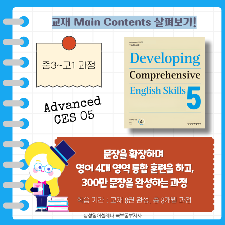 이 주의 교재는 <Advanced CES 05> ✏️Advanced CES 04 교재에서는 다양한 전치사의 쓰임과 역할, 관계부사 why를 학습합니다. 시작부 청크: You shouldn't, All the people 핵심부 청크: plant the roses, write more about them, make people relax 수식부 청크: after each meal, often, in a few months, for two weeks -삼성영어셀레나 Advanced 레벨은 문장을 확장하며 영어 4대 영역 통합 훈련을 하고, 300만 문장을 완성하는 중 3~고1 과정을 학습합니다. - 삼성영어셀레나 Advanced level 과정 : [학습 기간] 교재 8권 완성, 총 8개월 과정 ————————————————————— 이제 원어민처럼 사고하고....... <img src="https://blogthumb.pstatic.net/MjAyNTEyMTdfMTQ4/MDAxNzY1OTUyODAxOTkx.tM_QetrPmoHwJ7aohEuRtKARcdaRU8stT0jEBxNnVQsg.CkgFkPCbsCwkP-lM7fG5molqr26ih8Oo9hlAPvuT1FEg.PNG/KakaoTalk_20251215_173400270.png?type=s3" />