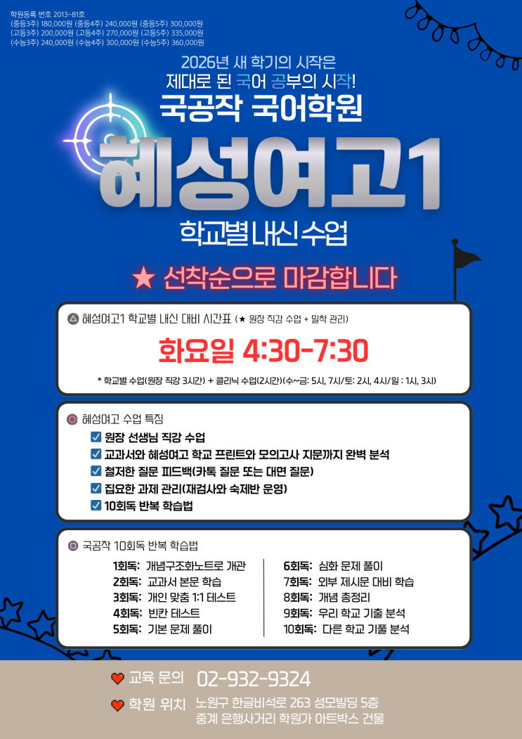 혜성여고1, 청원여고1 수업은 원장 선생님 직강 수업입니다. ^^ 원장 선생님 직강 수업(3시간) + 클리닉 수업(2시간) 주 2회, 5시간 수업으로 진행됩니다. ★ 선착순으로 마감됩니다. (교육 문의) 02-932-9324 <img src="https://blogthumb.pstatic.net/MjAyNjAyMTNfNzAg/MDAxNzcwOTUxOTM2MjIz.qUHzDpKTUy7UA9yCzTp5Xw1NvVGzSDc9B9pQTp5Aabwg.MaBUiOT2D6UsM4bFg8zCMqMIeVI0sYJQP8TOAXoGIz0g.PNG/1_%2811%29.png?type=s3" />