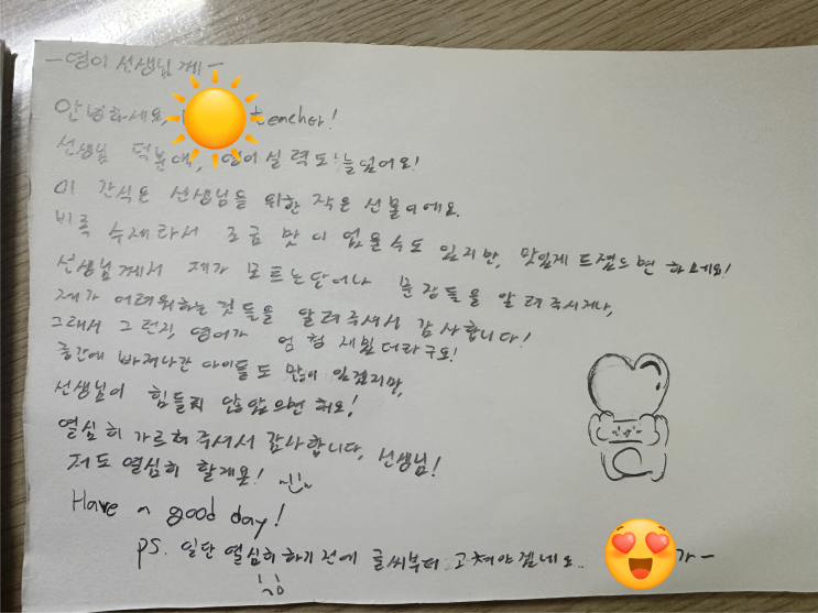 학생이 슬그머니 저에게 와, 요즘 핫하다는 두쫀쿠를 건내 줍니다. 놀랍게도 그 아래에는 편지가... 특강 할 때 유독 힘들어 했는데.. 같이 성장해나가는 보람을 느끼는 26년도 설입니다. 최선을 다해서 가장 완성도 높은 영어를 완성 할수 있도록 노력 하겠습니다. :) <img src="https://blogthumb.pstatic.net/MjAyNjAyMTNfMTk2/MDAxNzcwOTg1ODY0MjE4.p1SNc-S6WyE6E3CvyqAvEHVNuFZt6V31gG_KaAdjLtkg.x7ypK8yaomnm5-neHgdrlgvpyGS6hJYoNqeJNWccME8g.PNG/image.png?type=s3" />