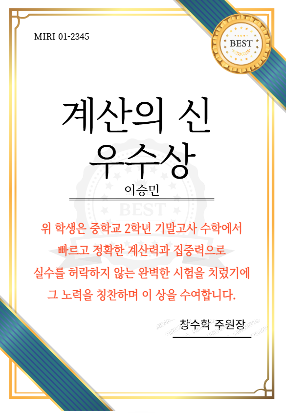 [창수학]선정중 2학년 기말 수학 - 이 o 민 학생 성적 우수상 수상