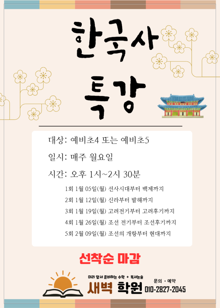 안녕하세요. #녹번역독서 #은평구독서 #새벽수학 #새벽독서논술 녹번역 No.1 #새벽학원입니다. 초등학교 5학년 부터는 한국사를 시작하죠~ 그 전 겨울 방학에 한국사 특강 준비하였습니다. 교재는 "그림으로 보는 한국사" 입니다. 교재는 각자 구입하여 집에서 읽은 후 수업을 합니다. 재원생을 20만원 신규생을 25만원 신청방법 문자 “이름/학년 /한국사 특강 신청합니다。” 혼자 보면 완독하기 어렵지만 함께하여 내용도 알고 토론도 하는 마무리로 글도 써보는 알찬 시간 갖도록 하겠습니다. 선착순 마감~!!! 시간만 맞는다면 서두르세요 ^^ #초등논술 #독서논술 #사고력논술 #창의논술 #글쓰기 #독서토론 #독해력향상 #어휘력....... <img src="https://blogthumb.pstatic.net/MjAyNTEyMjZfMjAx/MDAxNzY2NjkzODg4MDcz.G5Ka-kmzPznaPkZ_zMHLj4_RNBCt4vtxO1BwW3PvoWUg.tAs8vyvhlaxp7cnCTX1Hji-Mggy4R3chHFa98JlJbq4g.PNG/image.png?type=s3" />
