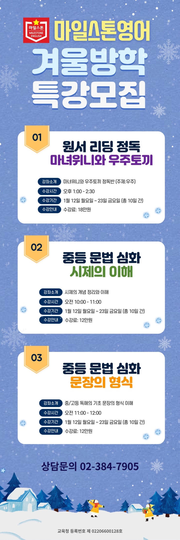 안녕하세요! 초중고 영어 성공 로드맵 마일스톤영어 입니다! 2026년 겨울방학특강 안내입니다. 마일스톤영어 학원의 방학특강은 학원 생들의 니즈에 따라 매 년 다르게 구성되고 있습니다. 이번에 개강되는 3개의 수업은 누구나 신청 가능합니다^^ 겨울방학을 알차게 보내고 싶은 친구들의 많은 신청 바랍니다:) 자세한 문의는 02.384.7905로 연락 부탁드려요! #역촌초영어 #은명초영어 #녹번초영어 #응암초영어 #신서초영어 #은평초영어 #예일중영어 #구산중영어 #충암중영어 #명지중영어 #덕산중영어 #영락중영어 #은평중영어 <img src="https://blogthumb.pstatic.net/MjAyNTEyMjZfMjI4/MDAxNzY2NzIxMDUzNTI1.Kyc8f0b0t8nQQ1x2sMAH31FleVbvIxUnlV8vnOfNTDYg.wb-DrpU3pPUT7vkIaECKpNwq7UbhVm2r6mKraVu7AqAg.JPEG/IMG_1947.JPG?type=s3" />