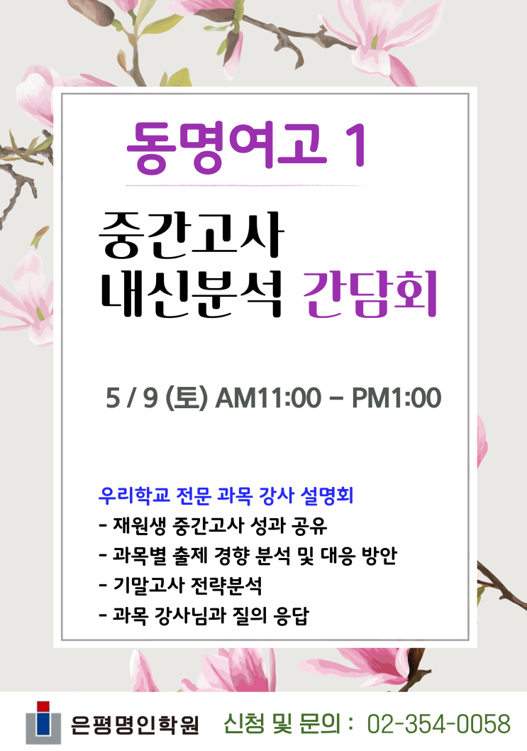 요즘 중간고사가 진행중입니다. 우리아이들에게 따뜻한 격려 부탁드립니다. 중간고사가 끝난 후 철저한 내신분석을 위해 학교별 간담회를 실시합니다. 고1 중간고사 분석 간담회네이버 폼 설문에 바로 참여해 보세요 https://naver.me/F7FSav1o 문자예약 : 010-6221-0052 (고1간담회/학교/이름/번호) 중간고사 보다 더 나은 기말고사 성적을 위해 과목선생님들과 은평명인학원은 최선을 다하겠습니다. 은평명인학원 상담 및 문의 : 02-354-0058 문자전용 : 010-6221-0052 #은평명인학원 #대치명인은평캠퍼스 #고등전문학원 #수능전문학원 #고1전문학원 #동명여고전문학원 #동명여고간담되 #동명여고1간담회 <img src="https://blogthumb.pstatic.net/MjAyNjA0MjZfODcg/MDAxNzc3MTgzMzYxODEx.oOQZSjgPjof1rA0UEkeIQfVM4aQoWbhu6MiRU_DwQlsg.sOhKvjVShJs9_gd1_U9fIEjNdEaGph2JG6g4md3bOiYg.PNG/%C1%DF%B0%A3%B0%ED%BB%E7_%BA%D0%BC%AE%B0%A3%B4%E3%C8%B8-2_260425.png?type=s3" />