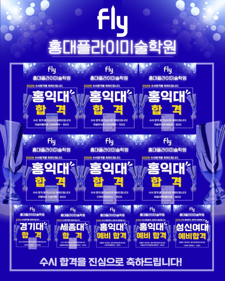 Let's FLY with FLY!! 안녕하세요 홍대플라이입니다 오늘은 학원에서 준비한 뜻깊은 수시 합격 소식을 전해드립니다!! 현재까지 진행된 입시에서 홍익대 6명 합격 예비 2명 합격 경기대 1명 합격 세종대 1명 합격 성신여대 1명 예비합격 이라는 성과를 이루었습니다!! 홍대플라이는 소수정예 20명으로 운영되며, 1 : 1 맞춤형 지도 시스템을 통해 학생 한 명 한 명에게 섬세하게 신경 쓰고 있습니다 올해 입시는 아직 진행 중입니다~ 홍대플라이는 마지막 발표가 끝나는 순간까지 변함없는 책임감으로 학생들을 지도하겠습니다 2026 수시 홍익대학교 미대 수시 결과 1차 합격생 10명!! 2026 수시 홍익대학교 합격생 6명!! 홍대플라이 합격생....... <img src="https://blogthumb.pstatic.net/MjAyNTEyMTJfMTg0/MDAxNzY1NTQ1MTI3MzQ3.fc3I2MnRtPSjb-1rNbZa8cUx84D31WbcQ0uSlYh4hbsg.acBv7X8cTvckb4vRXwrC2d2R_J25OwXS8zeIXYmyzykg.JPEG/KakaoTalk_20251212_181738778.jpg?type=s3" />