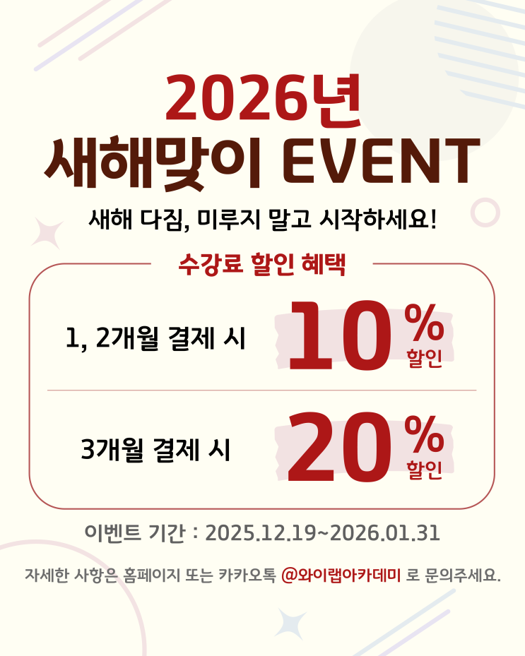 새해를 맞아 와이랩 아카데미에서 수강생분들의 새로운 시작을 응원하는 수강료 할인 이벤트를 진행합니다 배우고 싶었던 수업, 새해 할인 혜택으로 가장 좋은 타이밍에 시작하세요! 이벤트 기간 2025년 12월 19일 ~ 2026년 1월 31일 할인 혜택 - 1개월, 2개월 수강 시 10% 할인 - 3개월 수강 시 20% 할인 ❌ 할인 제외 강의 - 웹툰 마스터 클래스 - 2P 캐릭터 드로잉 기초 - 독호 캐릭터 드로잉 기초 - 토우 스토리 피드백 - 이밤 웹툰 스토리 이론 - 한동우 웹툰 스토리 이론 - 봄소희 로맨스 웹툰 스토리 이론 ⚠️ 유의 사항 - 본 이벤트는 이벤트 기간 내 1회 일괄 결제 시에만 할인 혜택이 적용됩니다. - 본 이벤트는 2025년 12월....... <img src="https://blogthumb.pstatic.net/MjAyNTEyMTlfMTY0/MDAxNzY2MTA5NTQyNTg0.EZjVoBR8BFytz4_KpToiSjMIsRAr4laa3ZbeImMEVDYg.oC3vJC7BLmbUnLV_ujoDwg-hoJ3r8JxWMh2Q4qa5hzYg.PNG/2026-01%BB%F5%C7%D8%B8%C2%C0%CC%C0%CC%BA%A5%C6%AE_SNS.png?type=s3" />