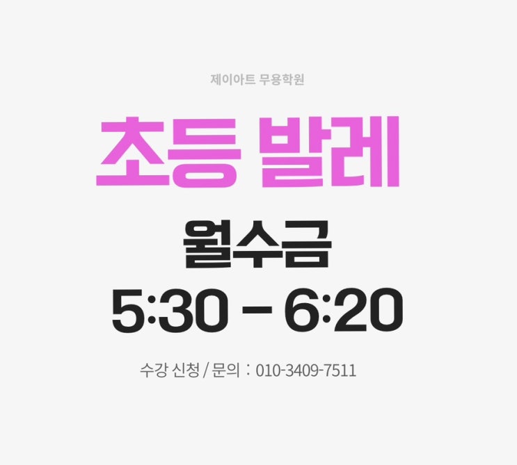 매주 월수금 발레 초등반 5:30-6:20 클래스 개설 인원을 모집합니다! 문의 및 신청은 010-3409-7511 로 문자 남겨주세요 ☺️ <img src="https://blogthumb.pstatic.net/MjAyNjAyMDVfNTkg/MDAxNzcwMjUxMzY1NzI4.7Jy79uvSFfqDkDCiiEBmBdbpduinzVkQQ0MA8hA2M7Mg.09Dnj_9tCL90yh2lprQfgSpRS_NOmQ6PDz7zDO4D0nkg.JPEG/IMG%A3%DF9001.jpg?type=s3" />