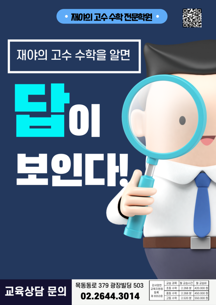 안녕하세요 ^^ 학생이 주인공이 되는 목동 앞단지 재야의 고수 수학 전문학원입니다. 오늘은 재야의 고수 수학학원이 어떤 방식으로 학생을 지도하고 어떻게 성적을 관리하는지 학부모님들께 자세히 소개해 드리려고 합니다. 많은 학원들이 잘 가르친다고 말하지만 진짜 중요한 것은 학생 한명 한명을 어떻게 관리하느냐입니다. 저희 재야의 고수 수학 전문학원은 바로 그 '관리' 에 초점을 둔 학원입니다. 1. 학생 개인 맞춤 커리큘럼 학생별 수준을 진단하고 학교별 시험 범위를 분석하여 학생마다 개인 맞춤 학습 플랜을 세우고 수업을 진행합니다. 2. 철저한 내신 대비 시스템 학교별 기출문제를 분석하고 서술형을 집중적으로 훈....... <img src="https://blogthumb.pstatic.net/MjAyNjAyMDlfODcg/MDAxNzcwNjMzNzA4NDA1.CTqPg_rZsZdnT8STPYdhRDc_u-92BV4HTFN7vDrg4wog.1EIatqxQW3asanLumWN08LthXYZSdWznTE6PqMV7oO0g.PNG/11%BF%F9_%B8%ED%BF%B9-033.png?type=s3" />
