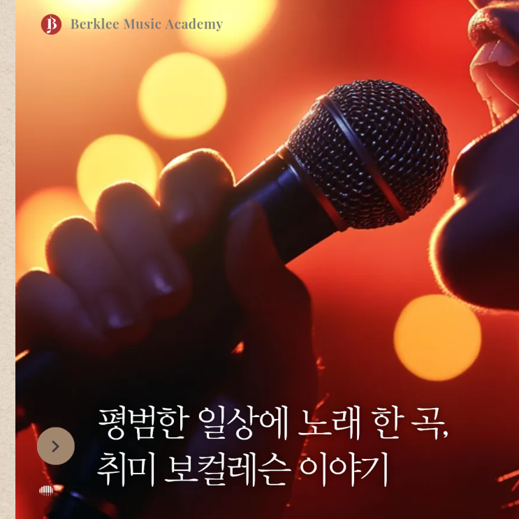Play Your Dream, Sing Your Future! 안녕하세요. 마곡에 위치한 버클리실용음악학원입니다. 노래, 잘하고 싶었던 적 있으신가요? 사실 꼭 가수가 아니어도, 누구나 한 번쯤은 “나도 노래 좀 잘해보고 싶다”는 생각을 해보셨을 거예요. 요즘은 단순히 실력을 키우기 위해서가 아니라 스트레스 해소나 취미 생활로 보컬 레슨을 찾는 분들이 정말 많아졌습니다. 취미로 시작하는 보컬레슨, 이런 분들께 추천드려요 ✅ 노래방에서 자신 있게 한 곡 부르고 싶은 분 ✅ 축가나 특별한 무대를 준비하고 계신 분 ✅ 평소 스트레스를 건강하게 풀고 싶은 분 ✅ 음악을 좋아하지만 제대로 배워본 적 없는 분 예전에는 “노래는 타고나는 거야”....... <img src="https://blogthumb.pstatic.net/MjAyNjA0MjdfMTA3/MDAxNzc3MjU0MTc5OTg1.x3Iqq7sqcI0ATxcJdl_EWV4FavH_-9W-dXqNv8oqoGwg.yl9oU2FkitBRd-JgsJHML-TBRT7RQKQZxjoi_gstV2Ag.PNG/%B8%B6%B0%EE_%B9%F6%C5%AC%B8%AE_%BD%C7%BF%EB%C0%BD%BE%C7%C7%D0%BF%F8_%281%29.png?type=s3" />