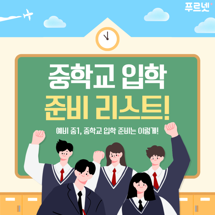 안녕하세요. 푸르넷입니다! 예비 중1 학생들, 그리고 학부모님들! 중학교 입학을 앞두고 무엇을 어떻게 준비해야 할지 막막하신가요? 처음 맞이하는 중학교 생활이니 불안하고 걱정스러운 마음이 드는 것이 당연해요. 오늘은 중학교 입학 전에 준비하면 중학교 생활 적응에 도움이 되는 것들에 대해 자세히 정리해 드릴게요. 입학 전, 남은 기간 동안 푸르넷이 알려주는 중학교 입학 준비 리스트로 마음 편히 입학 준비를 해보세요! 1. 체력·멘탈 관리하기! 중학교에 입학하면 공부 시간이 훨씬 늘어나고, 더 많고 어려운 내용을 배우게 돼요. 때문에 오랜 시간 집중할 수 있는 체력을 기르는 것이 정말 중요해요. 또한, 처음 배우는 어려운 내용....... <img src="https://blogthumb.pstatic.net/MjAyNjAyMTJfMzYg/MDAxNzcwODczNTI3OTUy.Fg7wy0qPWA0PJ5ReXJkczKHo7pCdcn5CZKA1sq2L3pIg.8QyS7IK9t1WWLCkZgknZrLy0EmNn-Hwu0f0iVsdr45cg.PNG/%BA%ED%B7%CE%B1%D7%BF%EB_%BD%E6%B3%D7%C0%CF.png?type=s3" />